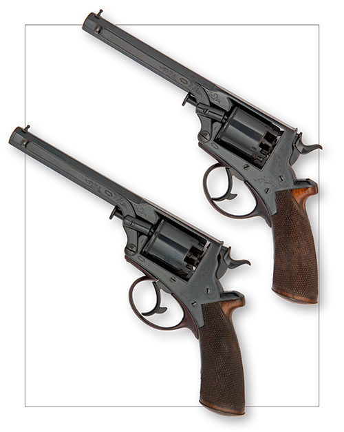 circa 1860, identical in form and engraving, with re-blued octagonal 6in. barrels, engraved bands at muzzles and scroll engraving to breech, the top-straps signed 'THOS. BLISSETT SOUTH CASTLE ST. LIVERPOOL', borderline engraved frames signed 'TRANTER'S PATENT' with scroll engraving to the action sides, borderline engraved five-shot cylinders with engraved rope-border to the leading edge, spurred hammers and swept-back chequered walnut grips with iron pommel-caps, both pistols refinished with some loss to engraved detail