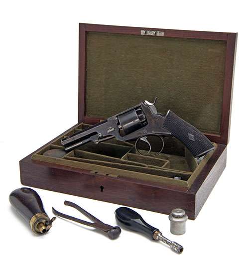circa 1858, with blued 3 7/8in. barrel (strong amount of finish), borderline engraved muzzle and breech, the top-strap signed 'WEBLEY & SONS, LONDON', borderline engraved frame, plain cylinder with tramline to leading edge and numbered chambers, spurred hammer, guarded trigger and chequered walnut grip with borderline engraved heel-plate, the underside of barrel fitted with an articulated loading lever, together with its original walnut storage case compartmented and lined in dark green baize and complete with a period mould, flask, cap-tin, turn-screw, oil bottle and cleaning rod, the last damaged
