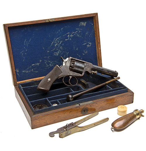 circa 1860, with blued 4 3/8in. octagonal barrel (much finish), the borderline engraved top-strap signed 'E. THOMAS & CO. MAIDENHEAD', solid borderline engraved frame, plain cylinder with tramline to leading edge, spurred hammer, guarded trigger and chequered walnut grip with borderline engraved heel-plate, the left side of barrel fitted with a hinged loading lever, together with its original oak storage case compartmented and lined in blue baize and complete with a period mould (possibly replaced), cap-tin, nipple-pot, oil bottle and cleaning rod, with a later flask, brass escutcheon missing from case lid