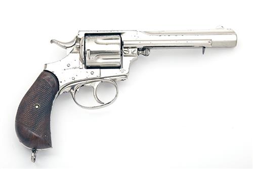 circa 1885, with 5 1/2in. ribbed octagonal barrel, the grooved top-strap signed ARMY & NAVY CSL EXPRESS', white-metal crescent fore-sight, side of frame marked with the calibre '.455' and the model designation on the right, Webley's 'winged bullet' logo on the left, ejector rod mounted on right hand side, fluted cylinder, hinged loading gate, 'bird's-head' butt with chequered walnut grips (replacements) and lanyard loop to base (fair amount of original finish remaining with some flaking, especially to cylinder)