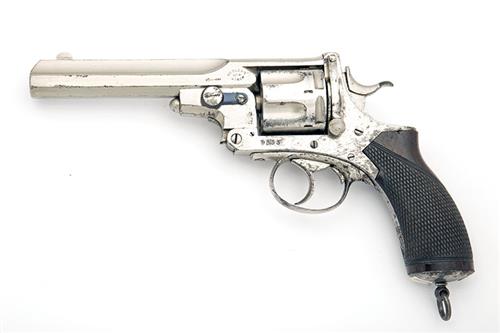 circa 1887, with 5 1/2in. ribbed octagonal barrel, the top signed 'P. WEBLEY & SON, BIRMINGHAM', crescent fore-sight, sighting notch to the rear of top-strap, fluted cylinder with quick release by a thumb-wheel, twin 'Pryse-action' locking bars, plain frame, chequered walnut one-piece grip and lanyard ring at heel, the whole retaining a good amount of original nickel-plated finish (extreme top of hammer cracked)