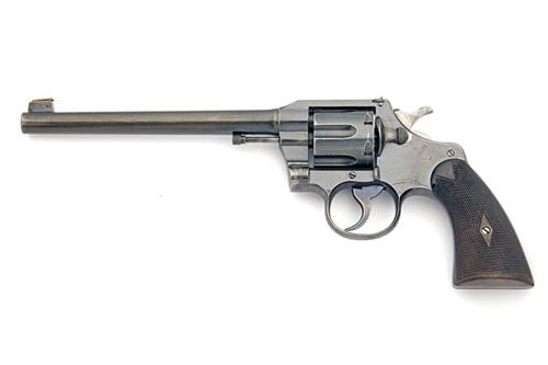 for 1913, with blued tapering 7 1/2in. barrel, the top signed by the maker and with patent dates to 1905, adjustable blade fore-sight, drift adjustable notch rear-sight, solid frame, swing-open fluted cylinder, and chequered walnut grips, strong amount of faded finish present