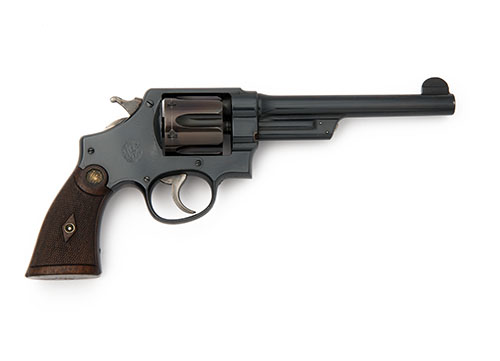 circa 1914, with 6 1/2in. blued barrel, the top signed by the maker and marked with patents to 1906, swing-open fluted cylinder with additional lock to crane, blued frame, chequered walnut grips with inlet medallions, colour hardened hammer and trigger, the whole an older re-finish