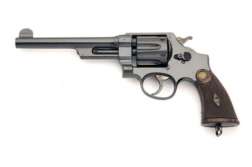 circa 1914, with blued 6 1/2in. barrel, crescent fore-sight, sighting groove to the top-strap, blued fluted swing out cylinder, blued frame, colour-hardened hammer and trigger and chequered walnut grips, fine condition (some possible refinishing to sideplate)