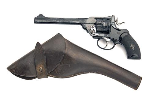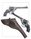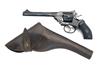 circa 1912, with rare 6in. barrel, ramp and crescent blade fore-sight, standing notch to the stirrup latch, the top-strap marked 'P.WEBLEY & SON, LONDON & BIRMINGHAM', fluted six-shot quick release cylinder, break-open frame, polished hammer and trigger and skinny chequered hard rubber grips, the whole appearing to have been black painted over original finish, complete with a period full flap leather holster for same