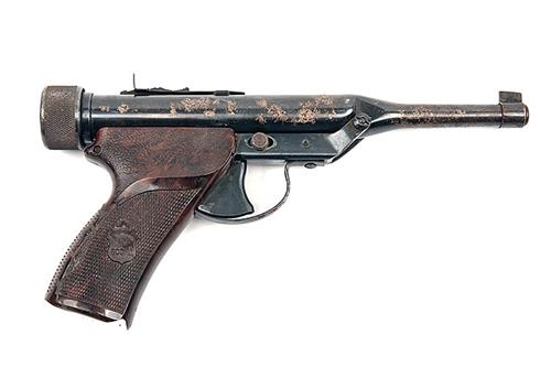 circa 1950, with 10 1/4in. internal barrel, moulded steel air-chamber with twist to load aperture at rear, engraved frame and chequered plastic grip (repaired), some loss to finish