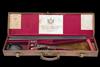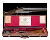 28in. nitro reproved sleeved barrels, 2 1/2in. chambers, bored approx. 1/4 and 1/2 choke, slim toplever, automatic safety with gold-inlaid 'SAFE' detail, gold-inlaid cocking-indicators, action marked 'B GRADE', best bold acanthus scroll engraving, the underside with 'PATENT EJECTOR', retaining traces of colour-hardening, 15 1/4in. replacement stock, weight 6lb. 11oz., in its lightweight leather case with full complement of Holland & Holland trade, instruction and charge labels
