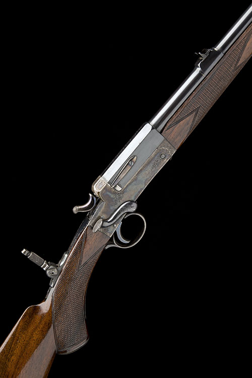 26in. nitro reproved barrel (lined to .22LR from .300 rook) with faceted breech end, the top flat engraved 'HOLLAND & HOLLAND. 98 NEW BOND STREET. LONDON.', bead fore-sight, open-sights with two folding leaf-sights, white metal inlaid sight lines and marked for 100 & 150 yards, unsigned action numbered 96229, central rebounding hammer, beaded border and partial scroll engraving retaining much colour hardening and finish, top strap mounted with a flip-up adjustable peep sight, 14 1/2in. figured pistolgrip stock, engraved pistolgrip-cap, splinter fore-end with horn finial, weight 5lb. 5oz.