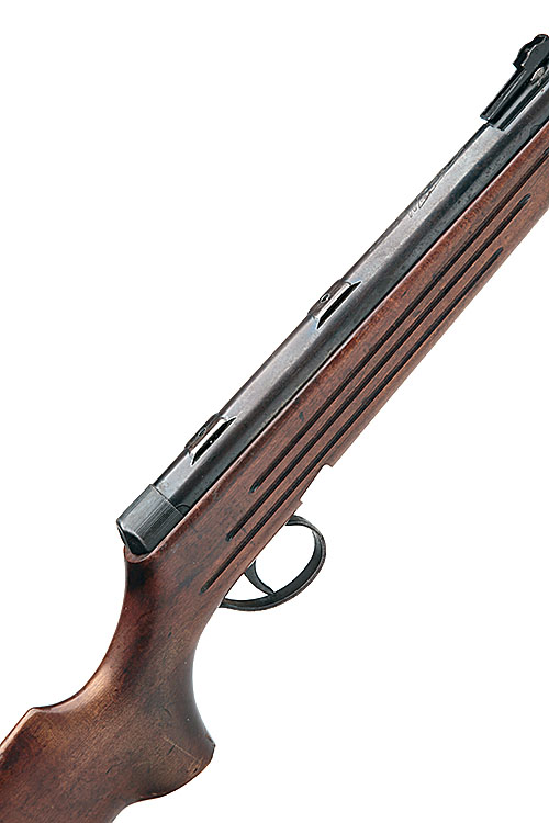 A .22 BREAK-BARREL AIR-RIFLE SIGNED BSA, MODEL 'METEOR', serial no. 2552, first model, with 18in. sighted barrel (rear-sight missing blade), air-chamber with two-piece rail and arrow trademark, beech half-stock, finish worn
