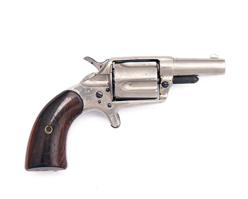 for 1884, with nickel-plated 2 1/4in. tapering round barrel signed 'COLT'S PT. FA. MFG. CO. HARTFORD CT. USA', the left side of barrel etched 'NEW HOUSE', crescent fore-sight, sighting groove to top-strap, fluted cylinder, solid frame with blued screws and hinged loading gate, spur trigger and flat-based smooth walnut grips, much original plated finish.