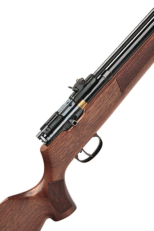A .22 PRE-CHARGED PNEUMATIC AIR-RIFLE SIGNED TITAN, MODEL 'MC010', serial no. 04133, with blued 14in. barrel, bolt action receiver, blued air reservoir with brass accents, chequered walnut anatomical full-stock, fitted with scarce open sights