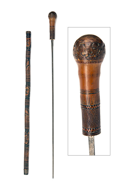 made for the grand tour circa 1900, the 25 1/4in. narrow blade formed from a cut-down fencing foil, the scabbard carved with figures of oriental aspect and dress bordered between geometric bands, the root-ball pommel en-suite, with a turned brass ferrule to tip