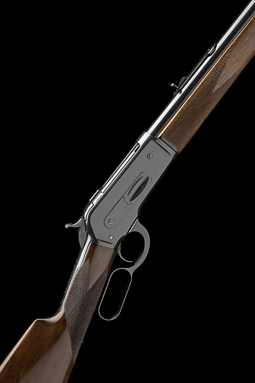 for 1912, with re-blued 26in. round profile barrel, the top-flat signed 'WINCHESTER REPEATING ARMS CO, NEW HAVEN CONN. USA' over 'PAT OCT 14 1884, JAN 20 1885' (re-applied), dove-tailed blade fore-sight, buckhorn rear-sight, plain receiver, the top-tang marked 'MODEL 1886, WINCHESTER, TRADE MARK REG IN U.S. PAT OFF', chequered straight-hand walnut butt-stock with iron chequered 'shotgun' heel-plate (repaired crack at wrist)), chequered walnut fore-end with iron nose-cap and full length under-barrel magazine tube, re-finished throughout