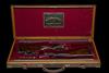 28in. nitro chopperlump barrels (No.2 London reproof in 1991), ribs gold-inlaid '1' and '2' at the breech ends, tubes engraved 'HARRISON & HUSSEY LTD. 41. ALBERMARLE ST. LONDON. W.', 2 1/2in. chambers, bored approx. imp. cyl. and 1/4 choke (No.1) and 1/4 and 1/2 choke (No.2), No.2 right wall at 18, toplevers gold-inlaid '1' and '2', automatic safeties with gold-inlaid 'SAFE' details, gold-inlaid cocking-indicators, best fine acanthus leaf and floral scroll engraving, retaining some renewed colour-hardening and finish, triggers set for the left hand, 15 1/4in. figured replacement stocks, cast on for the left shoulder and including 7/8in. leather covered recoil pads, weight 6lb. 10oz., in a brass-cornered oak and leather case with some Harrison & Hussey marked accessories and a gold-tooled Harrison & Hussey Ltd. trade label