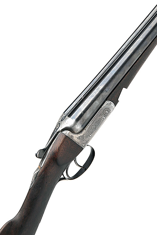 CHARLES LANCASTER 16-BORE 'A.& W. SPECIAL HAMMERLESS' BOXLOCK EJECTOR, serial no. 13969, 25 3/4in. (shortened) nitro reproved barrels, 2 1/2in. chambers, bored approx. true cyl. in both, some pits, treble-grip action with removable striker discs, the barrel rib, toplever and triggerguard engraved '1', automatic safety with gold-inlaid 'SAFE' detail, unsigned action engraved with acanthus scrollwork, 14 1/2in. stock with large comb insert and including 1 7/8in. wooden extension, weight 5lb. 7oz.