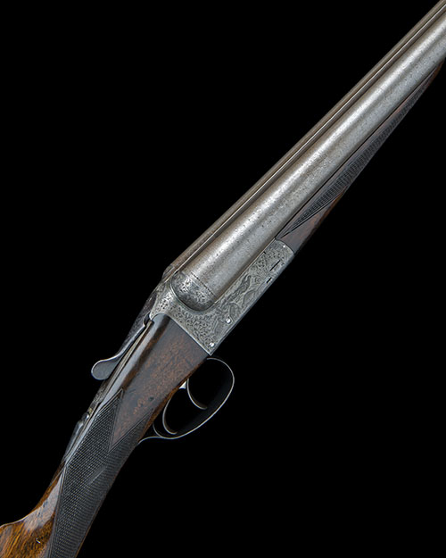 serial number on barrel loop only, 30in. nitro reproved damascus barrels, rib engraved 'WILLIAM HOWELL. PRICE STREET. BIRMINGHAM.', 2 1/2in. chambers, bored approx. true cyl. and 3/4 choke, some rivelling, unsigned treble-grip action, automatic safety with gold-inlaid 'SAFE' detail, profusely engraved with bold acanthus scrollwork and game scenes of pheasant and partridge, retaining very slight traces of original colour-hardening, 14 3/8in. stock, weight 6lb. 8oz., in a canvas and leather hammergun case with gold-tooled red leather Joseph Bourne & Son (incorporating Robert Hughes & Sons, James Bott & Son and Walter Edwards) trade label