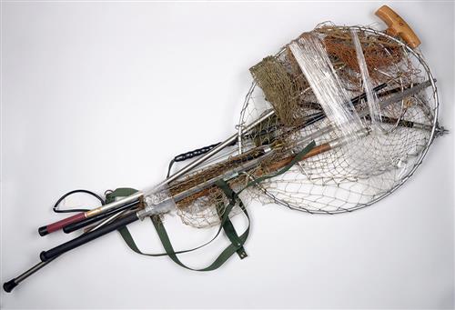 A COLLECTION OF FISHING RELATED ITEMS, comprising of rod carriers, landing nets, wading sticks