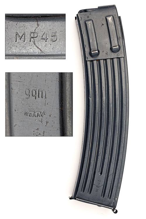 manufactured around April-May 1945 and of curved shape and similar form to an MP44 magazine(qv), blued ribbed steel construction with detachable floorplate and sprung follower, the right hand side with manufacturer code 'gqm' together with the relevant waffenampt mark, the left hand side stamped 'MP45'
