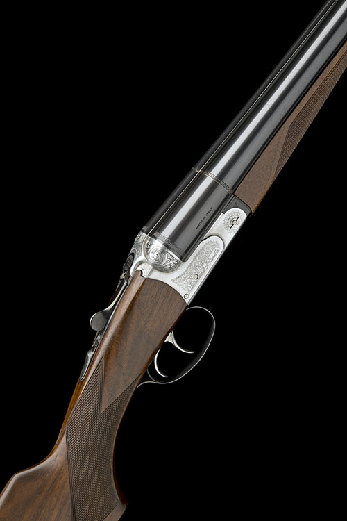 27 5/8in. nitro barrels, 2 3/4in. chambers, bored approx. 1/4 and 1/2 choke, stepped action, toplever inlaid in white metal with a lone pigeon in flight, automatic safety, articulated front trigger, acanthus scroll engraving, bright and blued finish, 14 3/4in. pistolgrip stock including trademark buttplate, weight 6lb. 10oz.