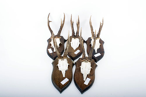 A COLLECTION OF FIVE ROE DEER SKULL MOUNTS, mounted on wooden plaques