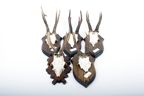 A COLLECTION OF FIVE ROE DEER SKULL MOUNTS, mounted on wooden plaques