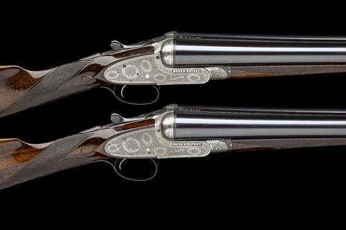 new 27in. nitro barrels (by the makers in 1978), barrel numbers 9797 / 8, ribs engraved 'BOSS & CO. 13/14 CORK STREET. LONDON. W.1.', and gold-inlaid '1' and '2' at the breech ends, 2 1/2in. chambers, bored approx. 1/4 and 1/2 choke, toplevers gold-inlaid '1' and '2', automatic safeties with gold-inlaid 'SAFE' details, removable striker discs, gold-inlaid cocking-indicators, Boss 1894 patent improved single triggers, rolled left edge triggerguards, best fine acanthus scroll engraving with floral bouquets, brushed bright and reblued finish overall, 14in. highly-figured stocks including 7/8in. rubber recoil pads, weight 6lb. 10oz., in a lightweight leather motor case (currently fitted for the 27in. barrels, would adapt to fit the 30in.)