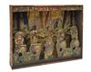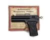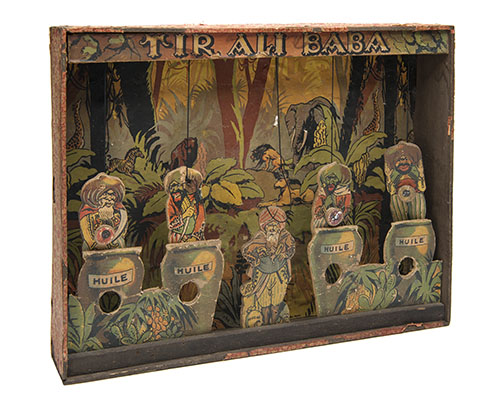 the target probably French, circa 1890 and designed for cork or pea-firing guns and comprised of a pine box with jungle themed illustrations, the foreground with four 'jars', each with a target aperture to release the elasticated 'thieves', the centre with a central figure of Ali Baba with a detachable elasticated head (some water staining, worm and other damage), together with a 'BRITISH AUTOMATIC MAGAZINE PISTOL' of cast iron construction, 4 3/4in. overall length, much original black painted finish and in its manufacturer's carton with printed instructions on the lid