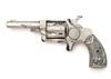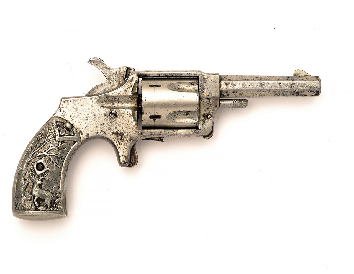 A .32 RIMFIRE POCKET REVOLVER SIGNED NORWICH ARMS CO, MODEL 'POCKET', no visible serial number, probably by Forehand & Wadsworth circa 1885, with 2 3/4in. octagonal barrel, fluted cylinder, solid frame with raised circular sideplate, exposed hammer and spur trigger and cast white metal embossed grips featuring stags in woodland settings, traces of nickel plated finish