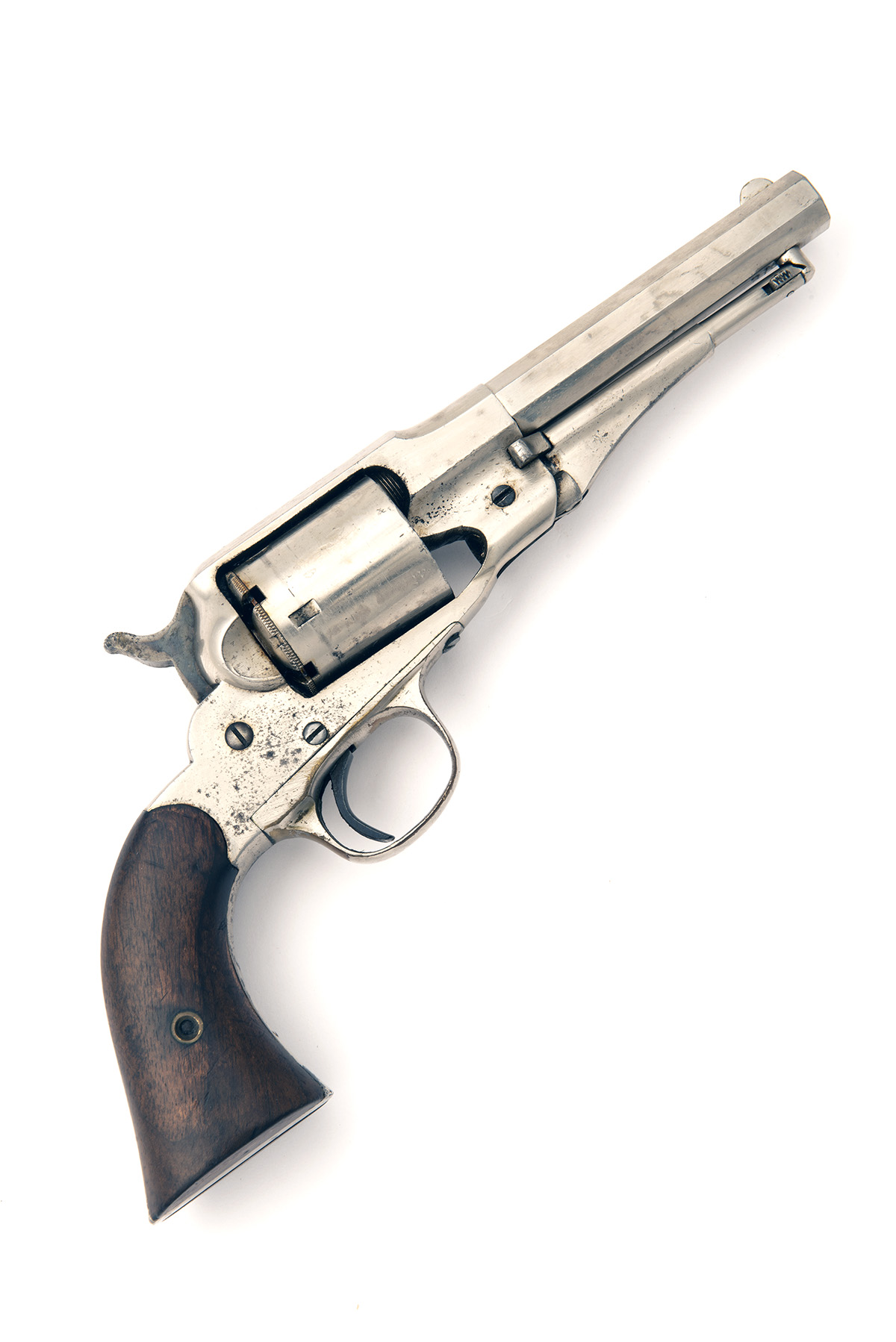 circa 1875, with nickel-plated 4 1/2in. barrel, the top-flat with make, patents and 'NEW MODEL' details, crescent fore-sight, sighting groove to the top-strap, plain plated cylinder with detachable back-plate, plated solid frame, smooth flared walnut grips and plated brass trigger-guard, the original loading lever retained for use as an ejector, much original nickel plated finish remaining