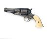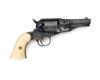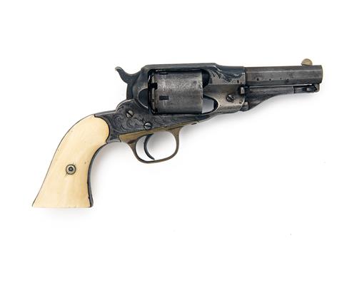 converted circa 1873, with slightly shortened 3 1/2in. octagonal barrel, the top-flat marked 'PATENTED SEPT 14 1858, MARCH 17 1863, *REMINGTON & SONS ILION NEWYORK USA, NEW MODEL', solid frame with later period loose scroll engraving, plain cylinder with detachable back-plate, hinged under-barrel rammer, smooth ivory grips and brass trigger-guard, finish worn