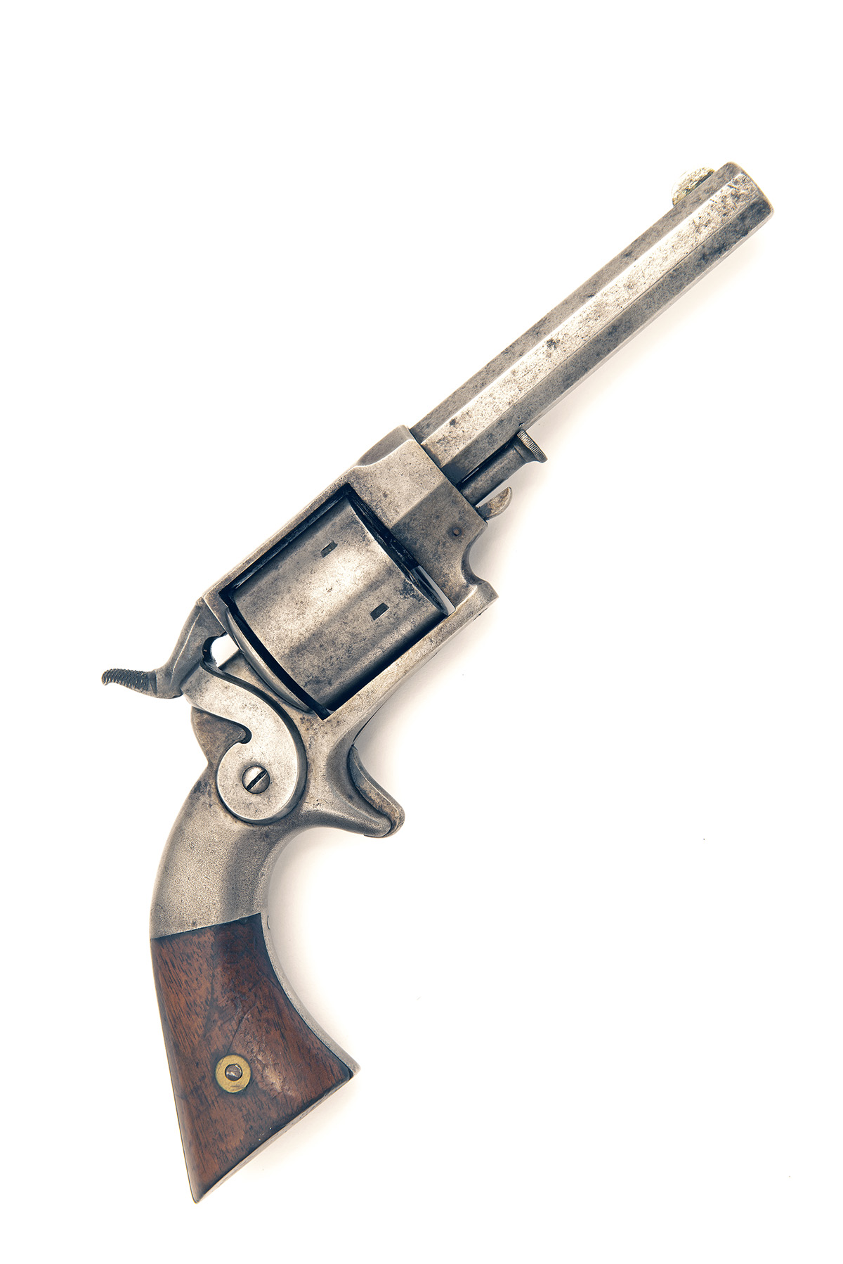 circa 1870, with 3 7/8in. octagonal barrel, the top-flat signed 'ETHAN ALLEN & CO, WORCESTER, MASS, ALLENS PATS. SEP 7. NOV 9. 1858 JULY 3. 1860', nickel crescent fore-sight, narrow sighting groove to the top-strap, plain cylinder, solid frame, slab-sided exposed side-hammer, spur trigger and smooth walnut grips, slight traces of finish