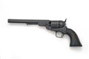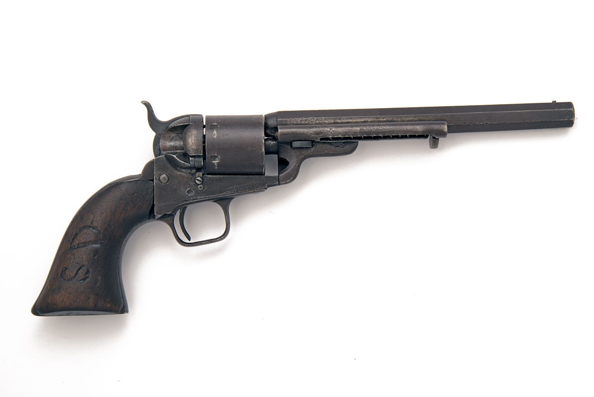 the original revolver from 1856 and converted to central fire circa 1872, with octagonal 7 1/2in. barrel, the top-flat signed 'ADDRESS SAM'L COLT NEW YORK CITY', screws to side of breech retaining the wedge and ejector-rod, plain shortened cylinder scrubbed of scene, the open iron frame with replacement standing breech, side loading gate, iron grip-straps and smooth walnut grip (worn, initials 'S.D.' carved into right hand side), minimal traces of finish, overall length of revolver 13 3/4in.