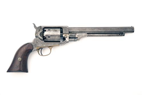 circa 1862, with octagonal 7 5/8in. barrel signed 'E. WHITNEY, NEW HAVEN', bead fore-sight, top-strap with pinched sighting-groove, solid iron frame, with wing-nut cylinder release, plain cylinder with traces of a roll engraved scene, articulated under-barrel rammer, brass trigger-guard and smooth flared walnut grips (small inlet working repair to left hand grip), minimal traces of finish