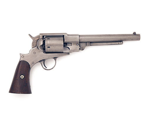 circa 1863-64, with round 7 1/2in. barrel, plain cylinder with recessed nipples, solid frame (missing flat spring retaining catch for cylinder), the top-strap signed 'FREEMAN'S PAT DECR. 9 1862' over 'HOARD'S ARMORY, WATERTOWN N.Y.', alongside the sighting groove, the latter barely legible, single action trigger-mechanism, smooth flared walnut grips and articulated under-barrel loading lever, the whole stripped of finish