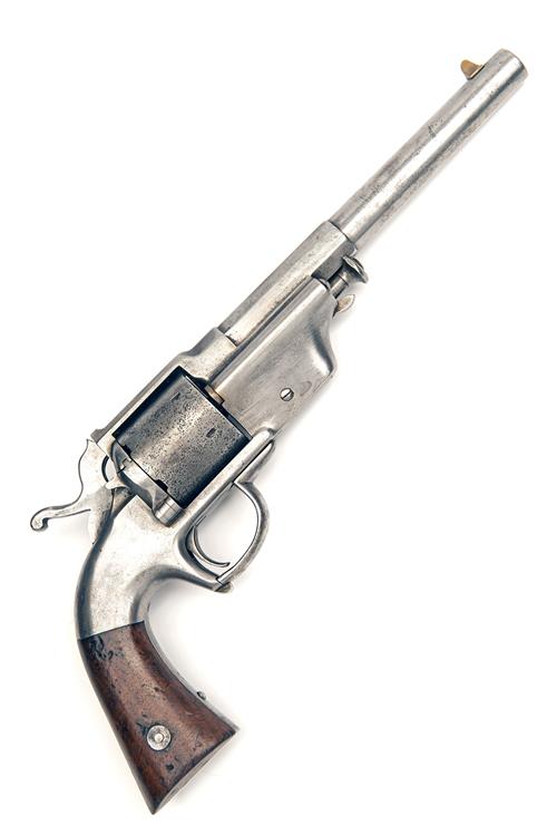 for 1861-62, with 7 1/2in. two-stage barrel (markings almost entirely erased), plain cylinder (external shallow pitting), plain solid frame with frontal cylinder release and central hammer (number 23 on loading gate), smooth walnut grips, hinged ejection lever forming the trigger-guard, completely stripped of finish