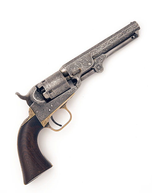 for 1869, with octagonal 5in. barrel signed 'ADDRESS COL SAML. COLT NEW-YORK U.S. AMERICA' within a border, the remainder fully engraved with American scrollwork on a dot-punched background, similar decoration to the open iron frame and the plain cylinder, repeated on the brass grip-straps (also bearing slight traces of silver plate) smooth walnut grip (left hand front corner repaired) and hinged under-barrel loading rod with engraved hinge, all matching numbers but no finish
