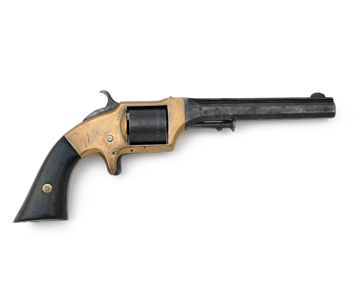manufactured between 1861-63, with iron octagonal 5 3/4in. barrel signed on the left hand side flat 'E.A. PRESCOTT WORCESTER, MASS' over obscured patent dates, raised sighting rib with crescent fore-sight, solid brass frame with moulded rear-sight to top-strap, exposed hammer, spur trigger, smooth flared walnut grips (heel strap bored for lanyard swivel, now absent) and exposed under-barrel cylinder pin