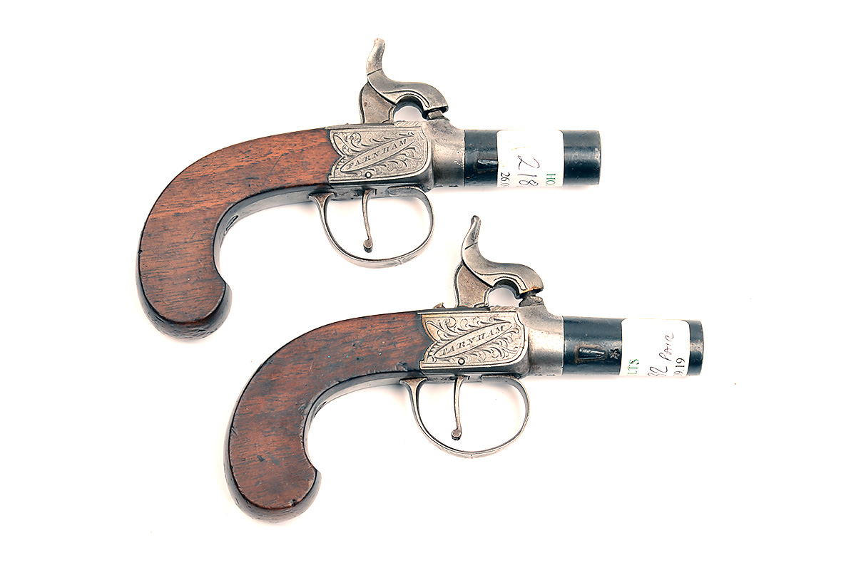 A PAIR OF 50-BORE PERCUSSION POCKET-PISTOLS SIGNED BUTLER, FARNHAM, no visible serial number, circa 1840, with reblued turn-off round 1 3/4in. barrels, squared engraved central hammer boxlock actions with guarded triggers and slab-sided walnut butts (2)