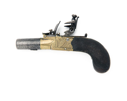 A 40-BORE FLINTLOCK BRASS-BODIED POCKET-PISTOL, no visible serial number,