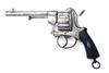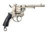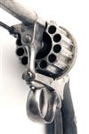 of Belgian manufacture but Birmingham proved, with round 4 7/8in. barrel, pillar fore-sight, octagonal barrel throat, fully fluted twelve-shot cylinder, rear-sight notch to the hammer nose, double action mechanism, open iron frame, plunge-ejector and chequered walnut grips with lanyard ring at heel