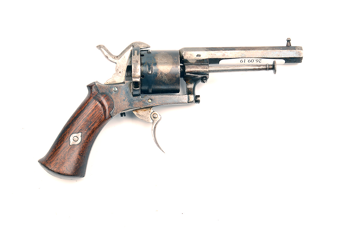 A 7mm PINFIRE POCKET-REVOLVER, UNSIGNED, no visible serial number, Belgian circa 1860, with octagonal 3 1/4in. barrel, plain cylinder, open iron frame and flared sooth walnut grips, strong traces of original blued finish