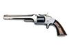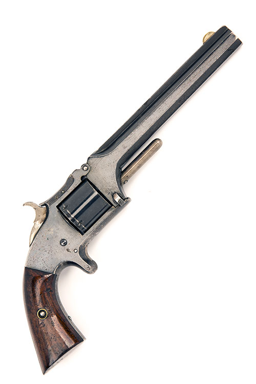 circa 1870 and being a Belgian licenced copy of the Smith & Wesson 'Old Model No2' revolver, with blued octagonal 6in. barrel, raised sighting rib signed 'SMITH & WESSON'S PATTERN MASS.', nickel crescent fore-sight, solid ejector spur below barrel, top-hinged frame with three pin top-strap, plain cylinder, spur trigger, colour hardened hammer and smooth rosewood grips, much original blued finish remaining