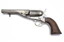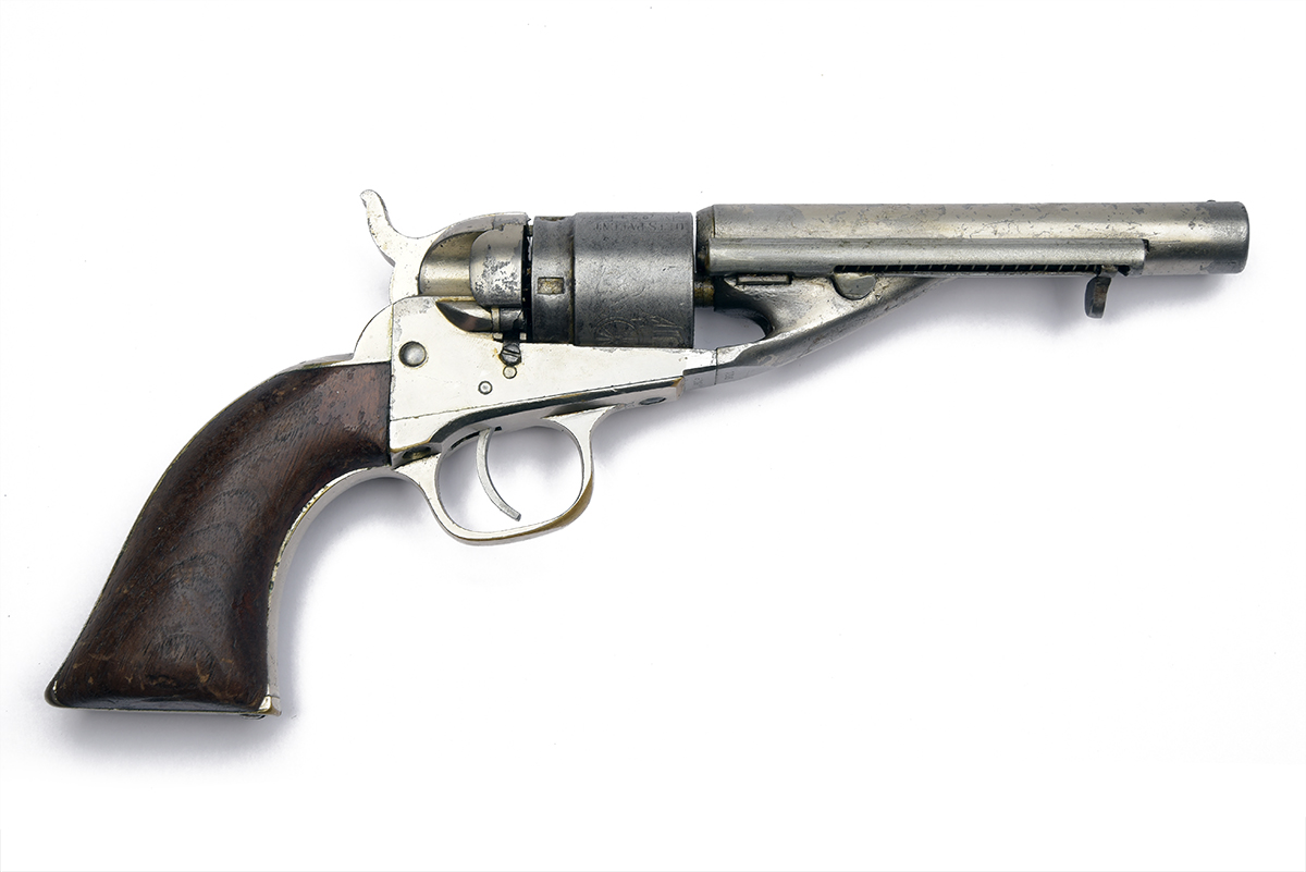 A .38 RIMFIRE POCKET-REVOLVER SIGNED COLT, MODEL 'ROUND BARREL POCKET NAVY WITH EJECTOR', serial no. 3218, for between 1873-75, with 4 1/2in. barrel signed 'ADDRESS COL COLT, LONDON', side mounted ejector, filled rammer slot, stepped cylinder with stagecoach scene, open frame with load gate and smooth walnut grips, replated in antiquity (losses)