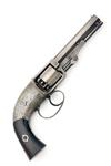 one of around 250 produced circa late 1850's, with 4 1/2in. octagonal barrel, the top-strap marked 'PETTENGILL'S PATENT 1856', double articulated under-barrel split loading-lever, scroll engraved solid hammerless frame, the underside marked 'RAYMOND & ROBITAILLE PATENTED 1858', plain cylinder, smooth flared walnut grips and guarded trigger