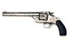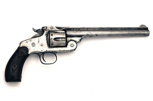 circa 1905, with round 8in. barrel marked on the left '44 S&W CTG', raised sighting rib signed 'SMITH & WESSON SPRINGFIELD MASS U.S.A.' with no patent dates, pinned crescent fore-sight, standing rear-sight notch integral with the locking latch, short ejector-housing, 1 7/16in. fluted cylinder, break-open frame, chequered hard-rubber grips with the 'S&W' trademark embossed at the head and blued trigger-guard, the pistol worn but retaining slight traces of nickel-plated finish
