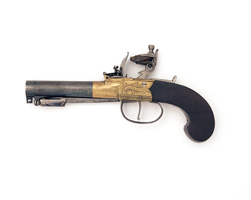 circa 1800, with blued turn-off 3in. barrel falsely rifled at the muzzle and fitted with a concaved sided triangular cross section sprung bayonet released by the trigger guard bow beneath, squared brass boxlock action with central hammer and engraved with a banner signed 'SUTHERLAND' on the left and a stand of flags with central oval panel signed 'LONDON', sliding safe to top-tang, walnut slab-sided butt and traces of finish, Birmingham proofs