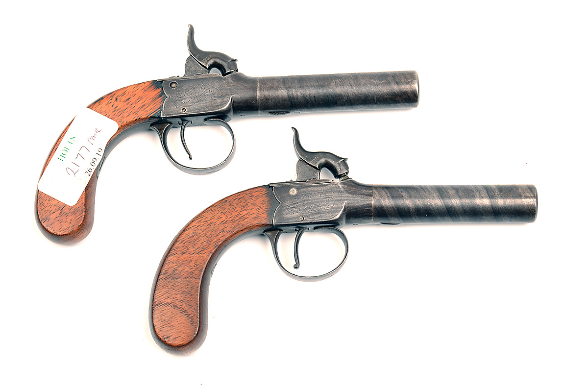 A PAIR OF 40-BORE PERCUSSION POCKET-PISTOLS SIGNED JOHN BLISSETT, LONDON, no visible serial numbers, circa 1845, with twist iron turn-off 3in. barrels signed by the retailer, squared boxlock actions with central hammers and guarded triggers and smooth slab-sided walnut butts