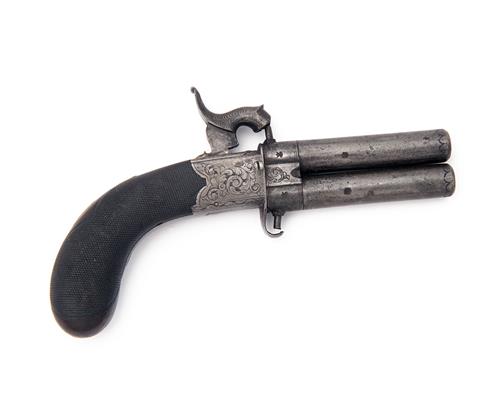 circa 1840, Birmingham proofs, with turn-off 3 1/4in. barrels (frozen), engraved bands and false rifling at muzzle, scroll engraved central hammer boxlock action with radiused corners, integral nipple guard to under-side, folding automatic trigger and finely chequered walnut bag-shaped butt with nickel oval escutcheon to wrist