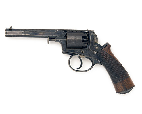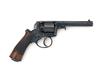 almost certainly a Belgian produced patent infringement, with blued octagonal 4in. barrel, engraved band at muzzle, dove-tailed fore-sight, the border engraved top-strap signed 'Dr G. LAMMERT', borderline and scroll engraved two-piece interlocking frame, plain cylinder, chequered rosewood one-piece semi saw-handled grip, faceted pommel-cap, guarded trigger and self-cocking mechanism, strong amount of probable original blued finish throughout