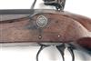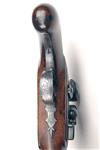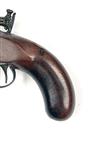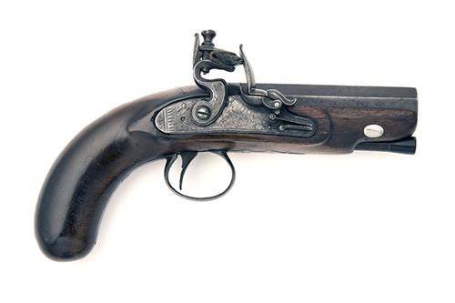 circa 1795, with octagonal 3 3/4in. barrel, the top-flat signed in silver script 'SHIP AYACONORA', solid engraved top-tang, slightly curved bevel edged flat lock with borderline engraving and round stepped tail, plain pan, bridled frizzen with roller spring, walnut fore-end with smooth bag-shaped butt (repairs to fore-end), iron trigger guard bow with pineapple finial, single barrel key and period horn-tipped wood ramrod